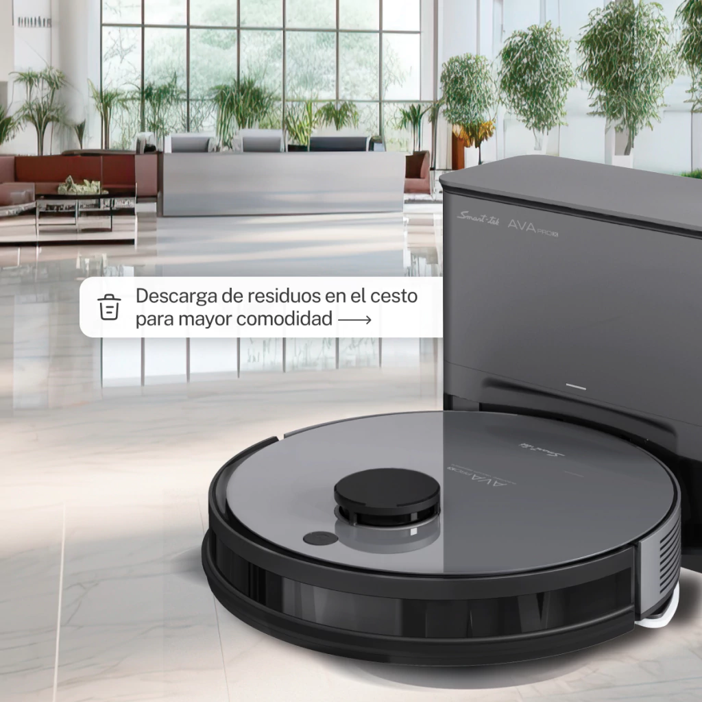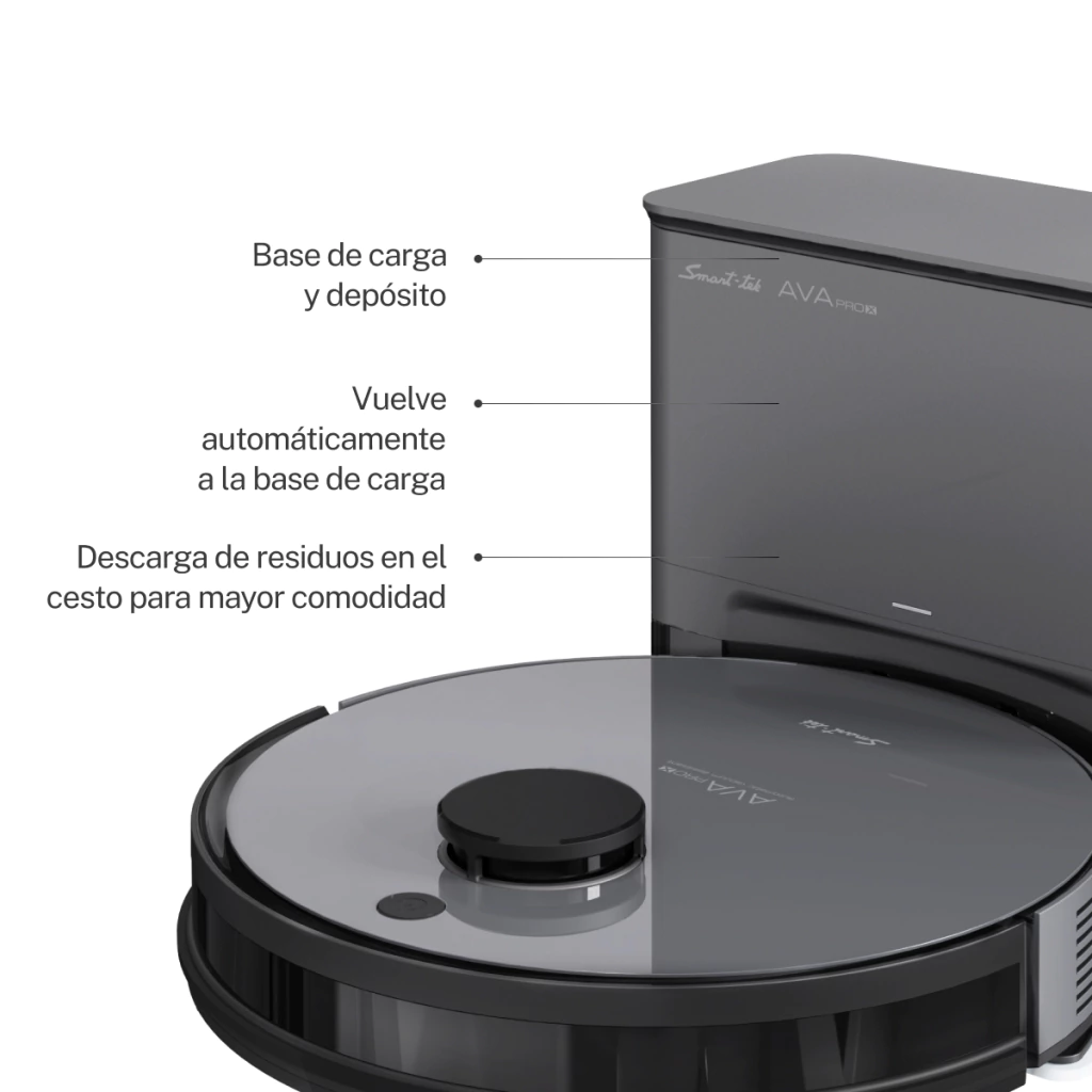 ✔ Ava Pro X: Control remoto o desde la app, programación de limpieza, sensores anti-caída y anti-golpes, detección de objetos, función mapeo y selección de áreas. Regresa automáticamente a su base y descarga residuos en su cesto.