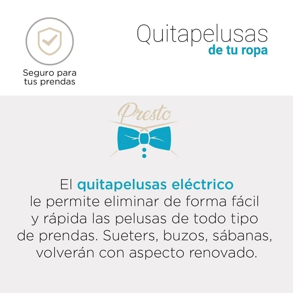 El quitapelusas eléctrico QP1214 es la solución perfecta para mantener tus prendas siempre como nuevas. Diseñado para eliminar de forma sencilla y rápida las pelusas de todo tipo de ropa, es ideal para sweaters, buzos, tapados, sábanas y remeras.